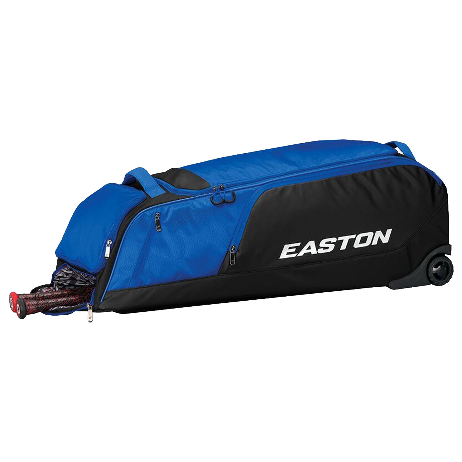 The new Easton Dugout Wheeled Bag is adurable equipment wheeled bag perfect for any player and theirgear. Ahard one-piece molded base providesstability and durabilityto the bottom of the bag. Thepadded bat compartment that can store and protect up to 5 bats, and an oversized large-mouth opening with YKK zippers provideseasy access into themainbagcompartment. Rollup to games or practicesthrough any terrain with the rugged inline wheels of the Dugout Wheeled bag.